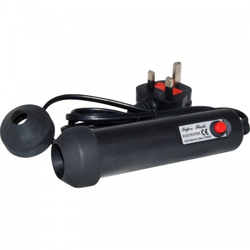 This candling lamp is hand held, push button and mains operated. It is purpose made for inspecting the embryo development during incubation. The lamp gives a high brightness beam which enables greater detail to be seen. Eggs may be examined for fertility after about 7 days. Infertile eggs will appear clear and can be rejected. Hold the lamp against the large end of the egg. Darken the room to improve clarity. Do not overheat the eggs by holding the lamp close for too long.